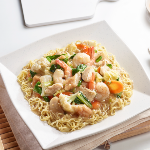 Noodle topped with Stir-Fried Assorted Vegetables, Chicken, Shrimp, Fish Cakes and Fish Balls