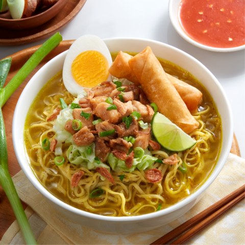 GM's signature noodles topped with delicious cabbage, egg and chicken and drizzled with fresh and warming chicken soto sauce. Served with Fried Spring Rolls.