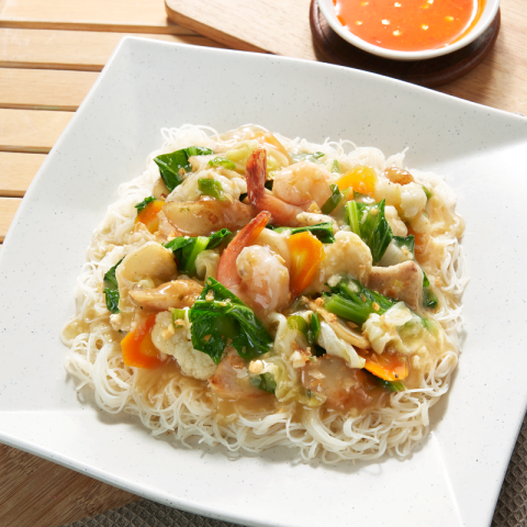 Vermicelli topped with Stir-Fried Assorted Vegetables, Chicken, Shrimp, Fish Cakes and Fish Balls
