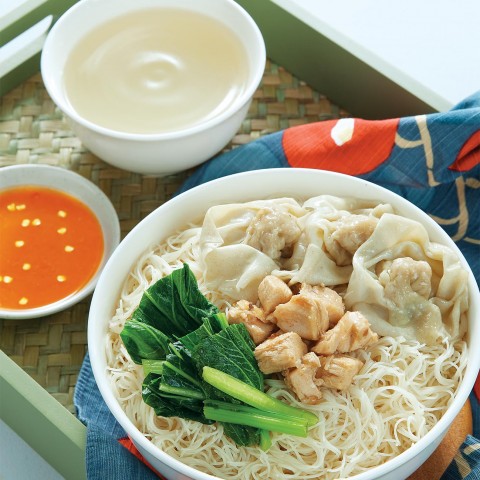 Bihun yang disajikan dengan potongan ayam dan pangsit rebus, lengkap dengan kuah gurih.