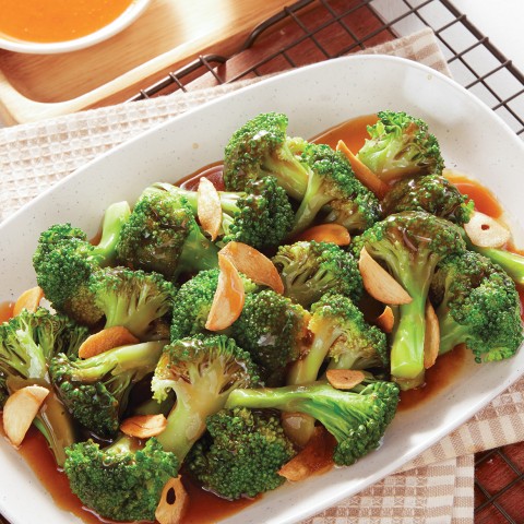 Brokoli yang dimasak dengan saus tiram dan diberi taburan bawang putih goreng (reguler).