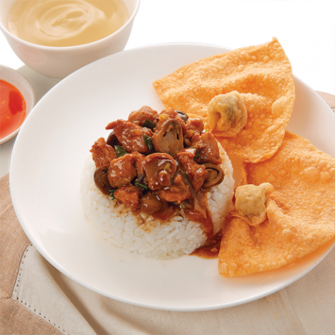 Rice with Chicken in Special GM Mushroom Sauce & Fried Wonton