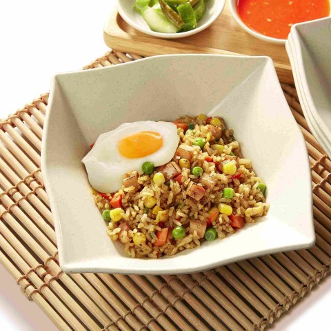 Nasi goreng dengan isian ayam asap dan telur, ditambah kacang polong, buncis, jagung manis, dan wortel serta irisan cabe merah dan daun bawang serta telur mata sapi yang membuatnya menjadi spesial (Small).