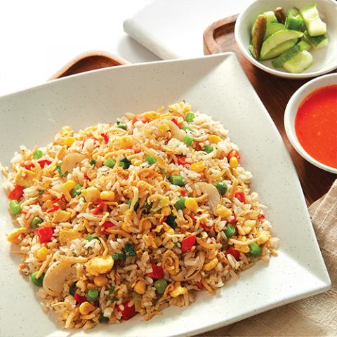 Nasi goreng porsi reguler dengan isian telur, bakso ikan, dan ikan teri yang dipadukan dengan mix vegetables, irisan cabe merah, dan daun bawang.